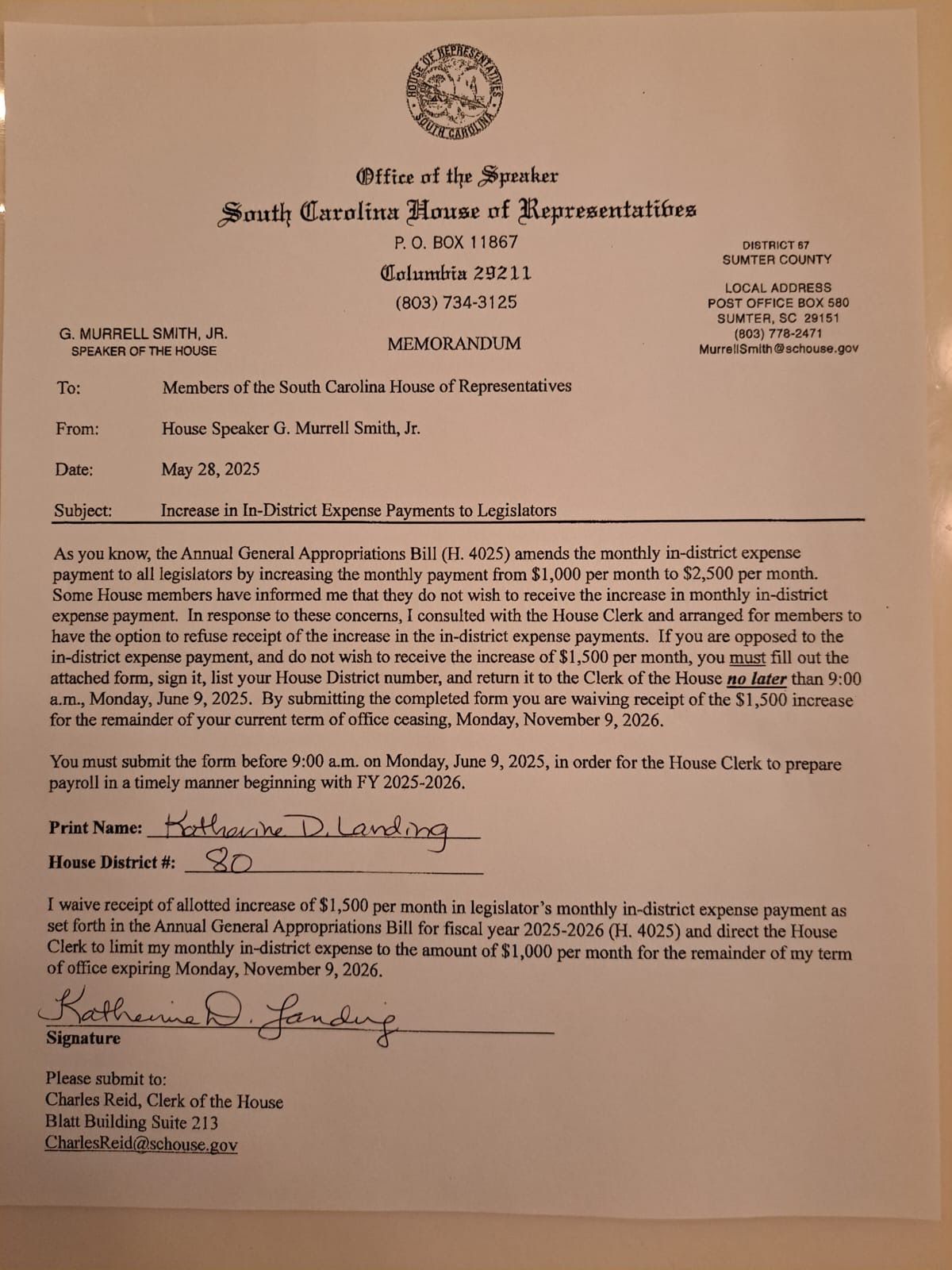 On Wednesday, May 28th during our Majority Caucus Meeting, I was hoping to bring common sense to our Budget Reconciliation process by urging the Conference Committee members to strike the proviso that had been inserted by the Senate to raise our pay by $18,000 per year beginning July 1st ($25,500 up to the next election in November 2026). The total cost for this proviso is $4,335,000! We had voted against this overwhelmingly when it was brought as an amendment to the budget by a Democrat House Member. We also voted overwhelmingly to strike it from the budget when the Senate first sent their version over to us. Why then, did our Conference Committee Members go along when the Senate Conference Members insisted that they would not pass the budget without the raise? Our Conferees should have countered that we would not vote for a budget with the raise. Instead, they gave in, saying they had "whipped" enough of the Members to know the budget would pass regardless. My group, under Whip Representative Heath Sessions of 6 Members, voted 5-1 against, so I believed we had the support to strike the proviso. In the end, we were told the vote was up or down for the budget with no option to strike the proviso because they had agreed in the Conference Committee Meeting. This was a big disappointment to me, and I was prepared to vote against the Budget.