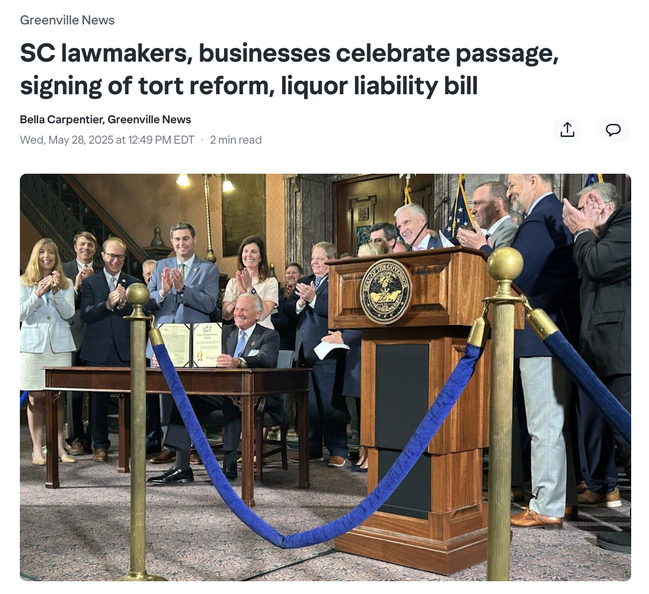 On Wednesday before Budget Reconciliation, Governor McMaster held a ceremonial signing for H.3430, Tort Reform & Liquor Liability. I serve on the Judiciary Committee that vetted this bill multiple times, as well as the Ad Hoc Committee that held an additional hearing regarding the primary differences between this bill and the Senate's version. In the end, we merged some of the best from each, and left out the worst from S.244. Bottom line, our restaurants, bars, and even VFW and other member organizations will be able to greatly reduce their insurance premiums by following very reasonable steps regarding training for servers, times for serving, and percentages of food vs. alcohol. Also, liability will be more proportionate to the level of responsibility of blame. We still have much more work to do, especially regarding our DUI laws, but this bill, now law, is a great step in helping our hospitality industry while still protecting the rights of victims & their families.